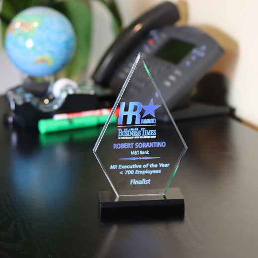 Clear Acrylic Diamond on Black Acrylic Base. Honor extraordinary achievement with this laser engraved award of classic design.